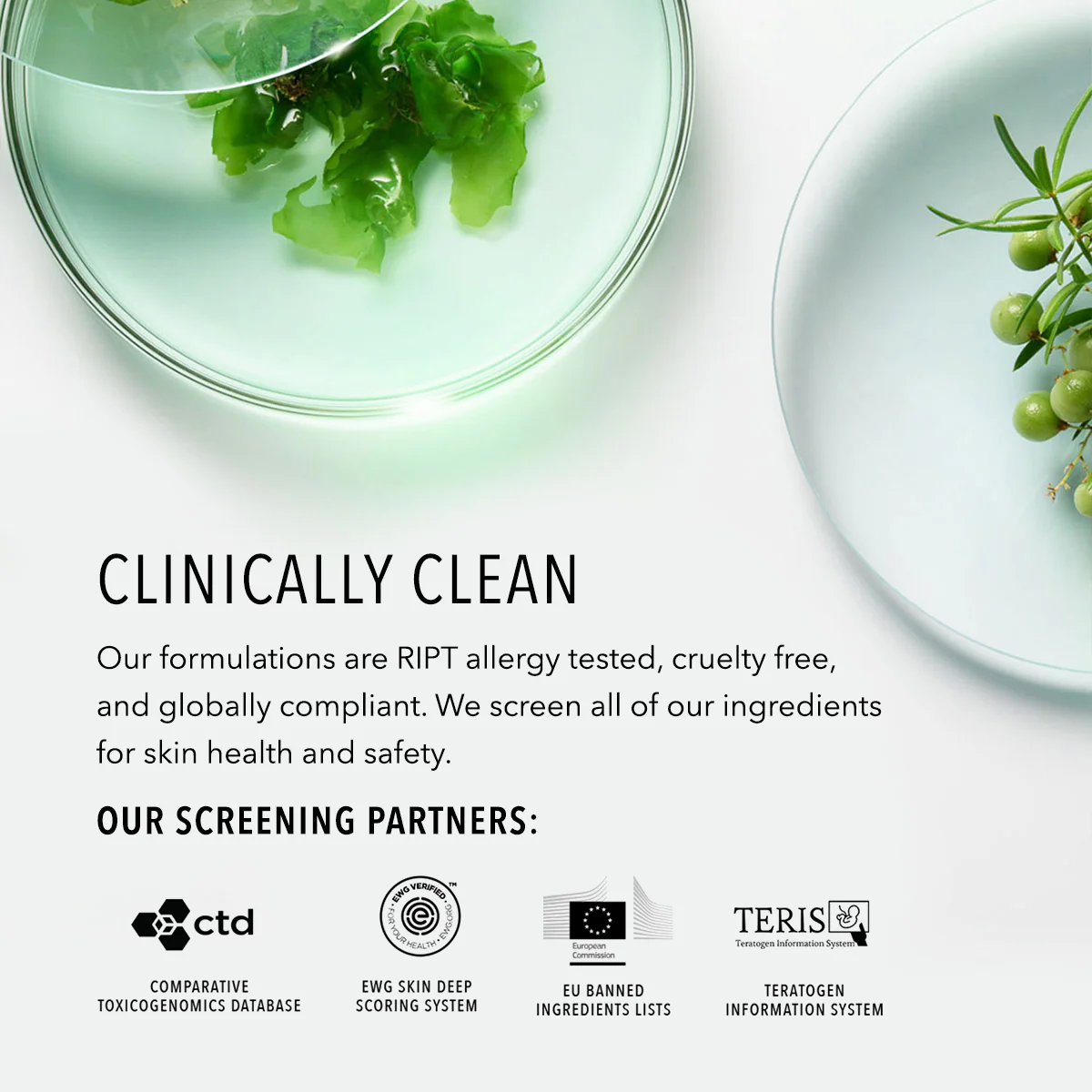 Free from genotoxins, parabens, phthalates, sulfates, and harmful fragrance. Our formulations are RIPT allergy tested, cruelty free, and globally compliant. We screen all of our ingredients for skin health and safety.